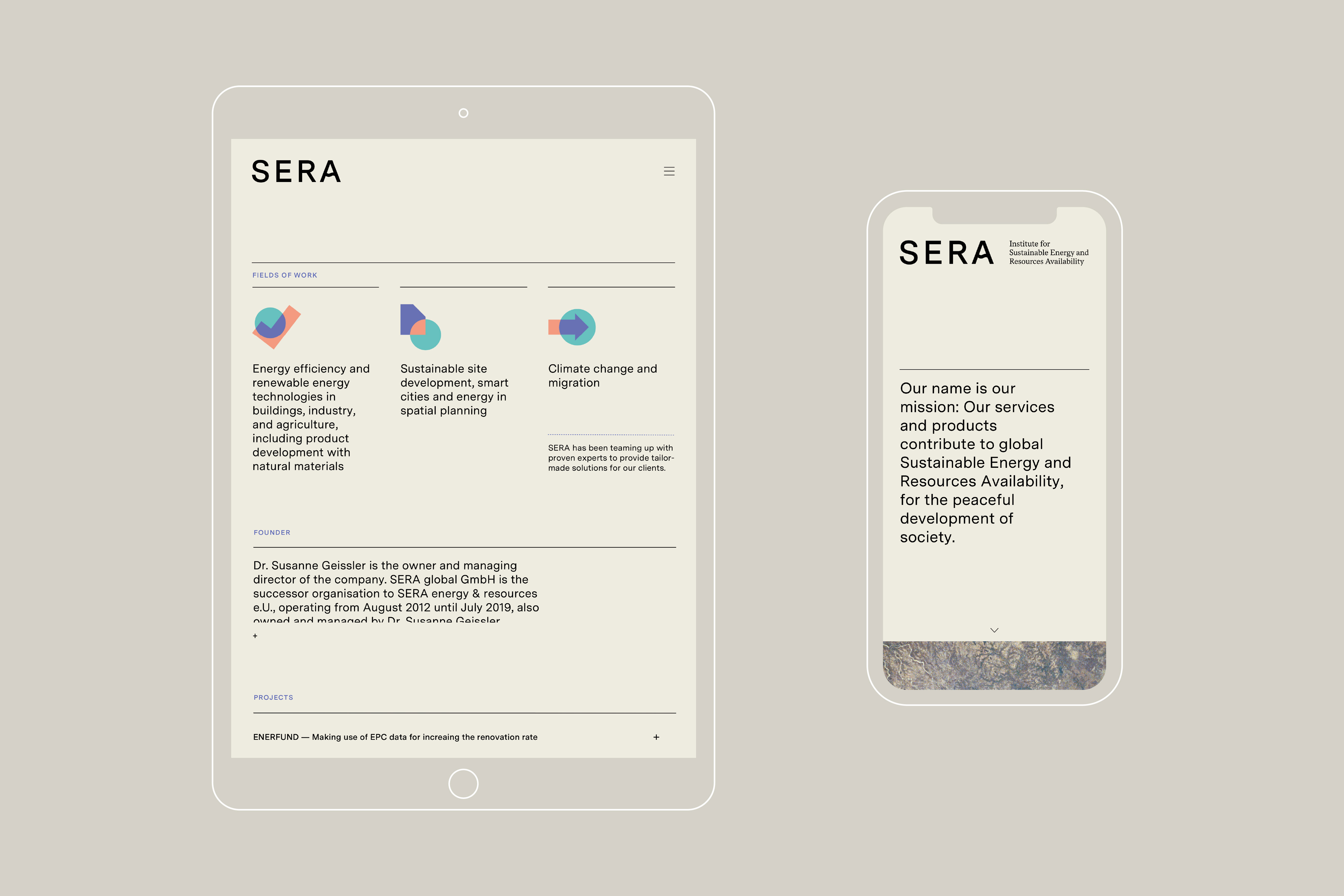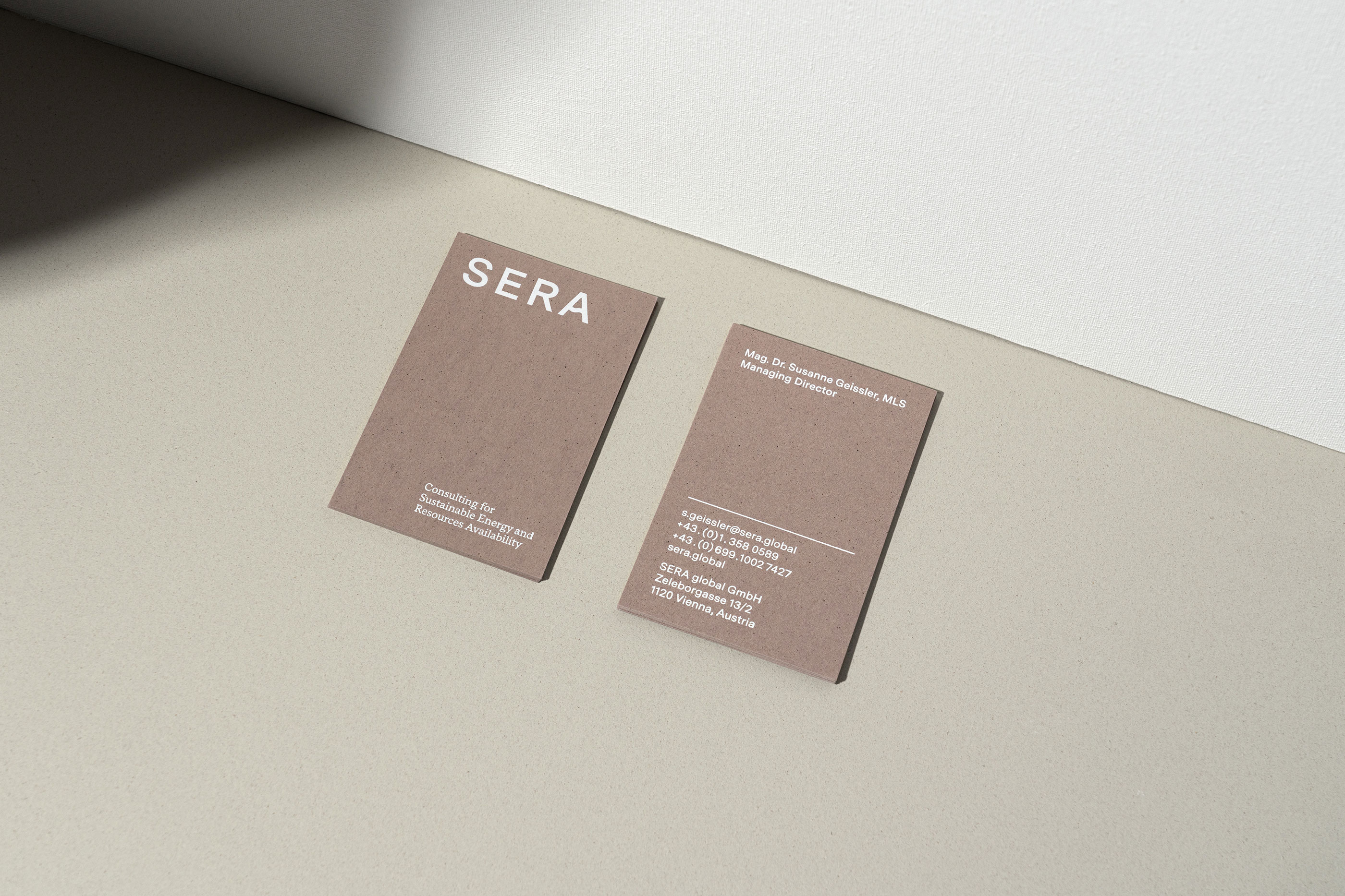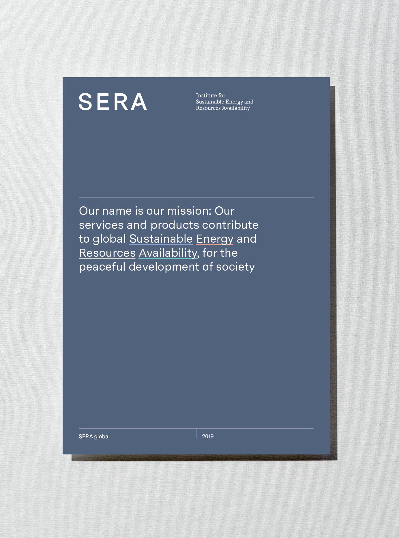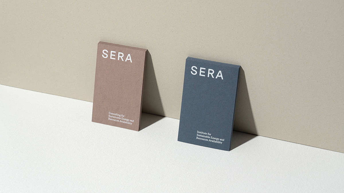 The ‘Institute for Sustainable Energy and Resources Availability’ expanded its task field and required a visual redesign. SERA works at the interface of research and public administration in the fields of energy efficiency, sustainable site development, climate change and migration. Thus the institute needed a visual identity that conveys its scholarly background and competencies while feeling contemporary. We created a simple yet characteristic logotype which gives a hint to the matters at hand. The determining elements for the new brand identity are a strong use of typography and colour. All stationery is printed on upcycled paper using organic produce waste.