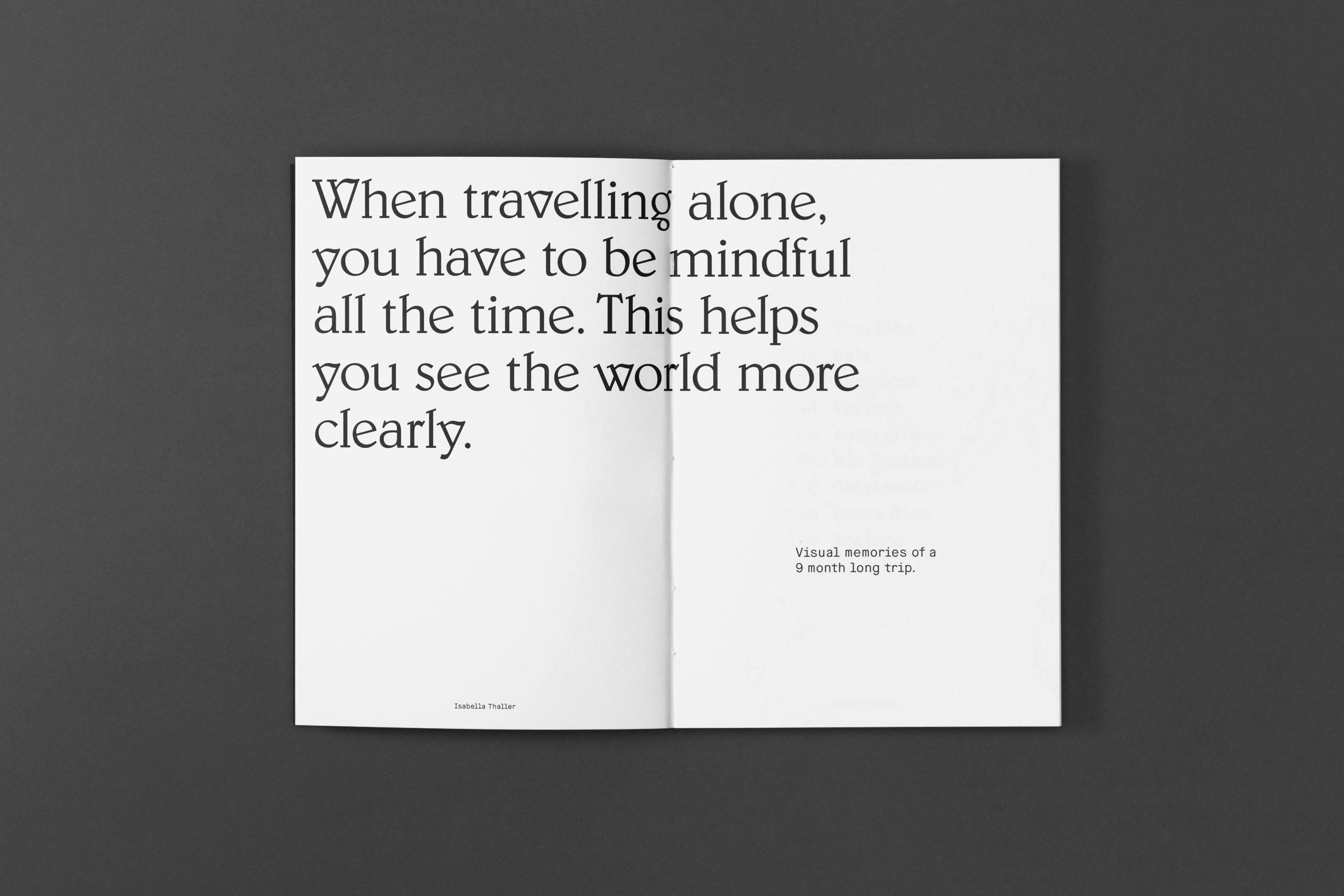 When we immerse ourselves in foreign surroundings we gain new impressions and often take on an observing role — even more so when travelling alone. Isabella Thaller captured such moments when travelling around the world for nine months. The outcome is a book with about 90 photographs from nine countries that she has visited during this trip. In the book, she shares her extraordinary perspective on everyday life and special places. Printed on an Indigo Press on Mohawk Superfine uncoated paper, the images display brilliance while maintaining their natural style. The book's screen printed greyboard cover and open stitch binding add to its natural feeling.